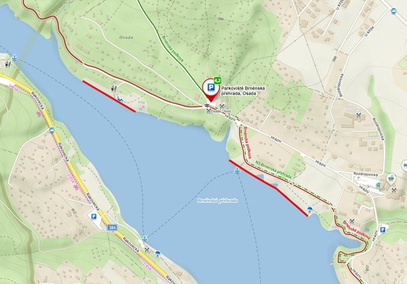 Parkování bude možné pouze na parkovišti Brněnská přehrada, Osada a u sjezdu k trati na Sokolské koupaliště viz. mapa.